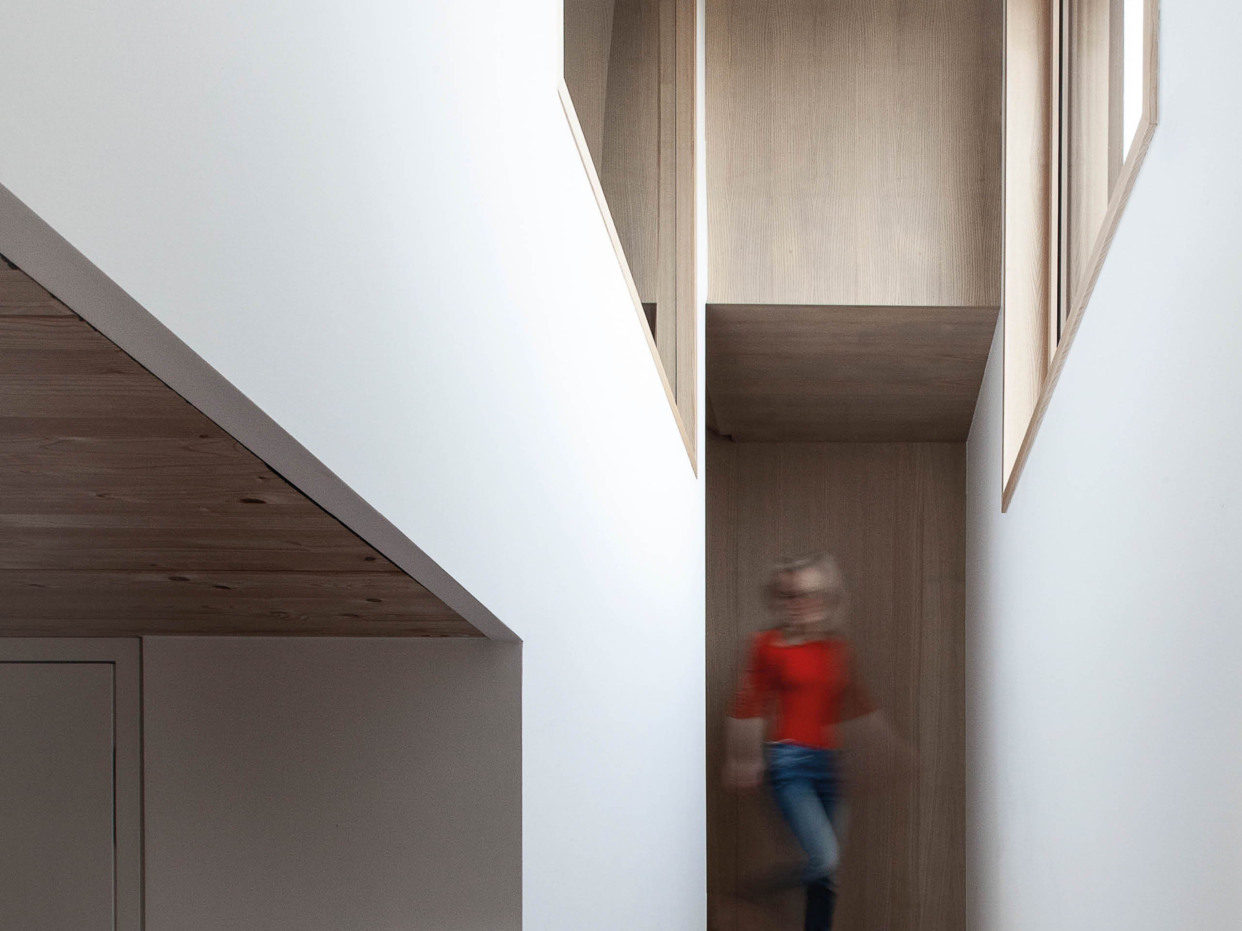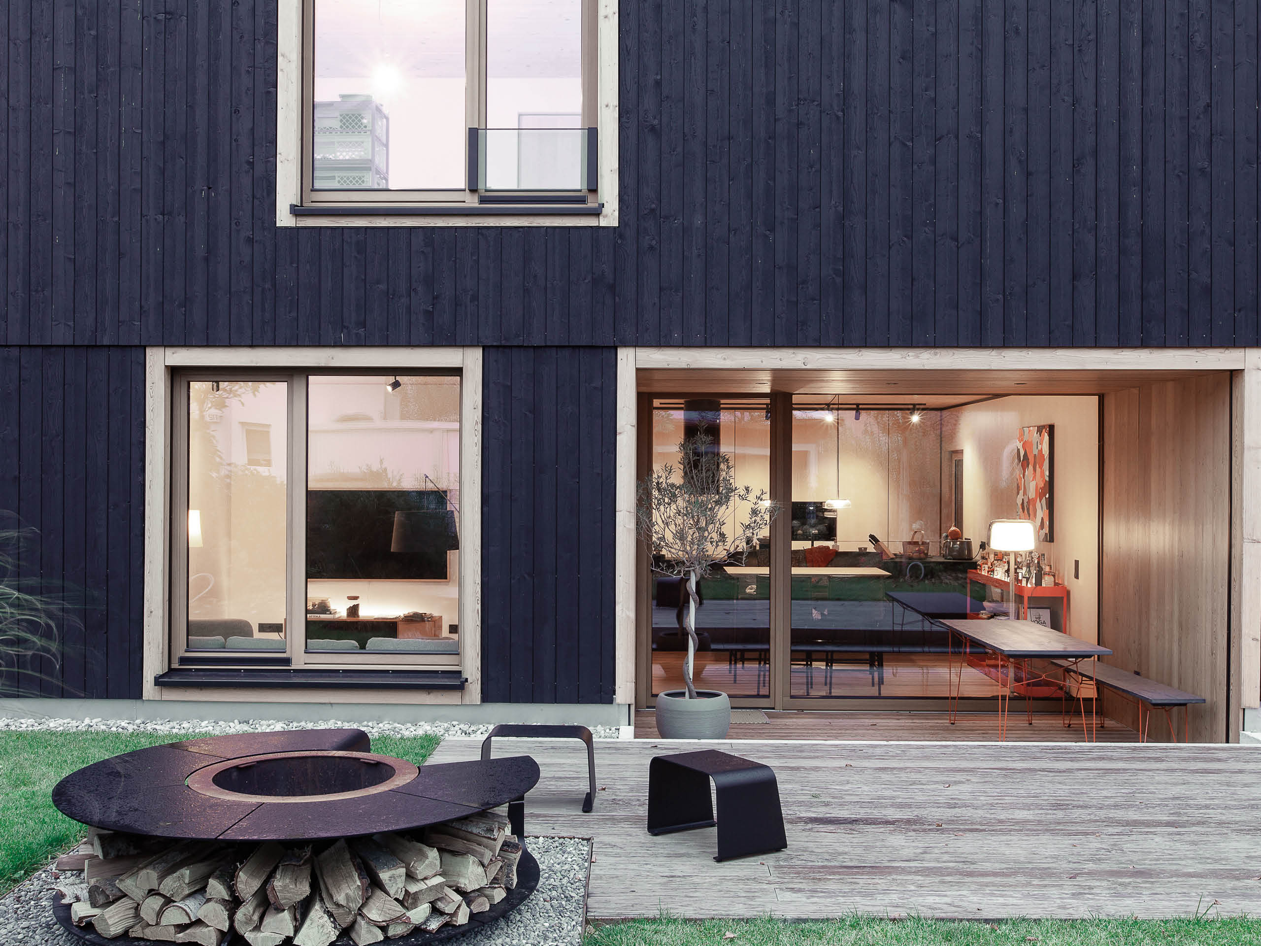 Schlicht und schwarz sollte es sein, da waren sich die Familien einig. Helle Lärchenfenster ergänzen dabei die dunklen Fassaden. Dieser Kontrast wurde im Inneren gekonnt umgekehrt, wo dunkle Flächen Akzente im ansonsten naturfarbenen Interieur bilden. Die Funktionsbereiche gliedern sich in Essbereich und Küche im Erdgeschoss, Schlafplätze im Obergeschoss und Arbeits- und Hobbyräume im Dachgeschoss. Kein Wunder, dass die Baufamilien so zufrieden sind: „Unser Traum vom stilvollen Wohnensemble ist auf ganzer Linie wahr geworden.“