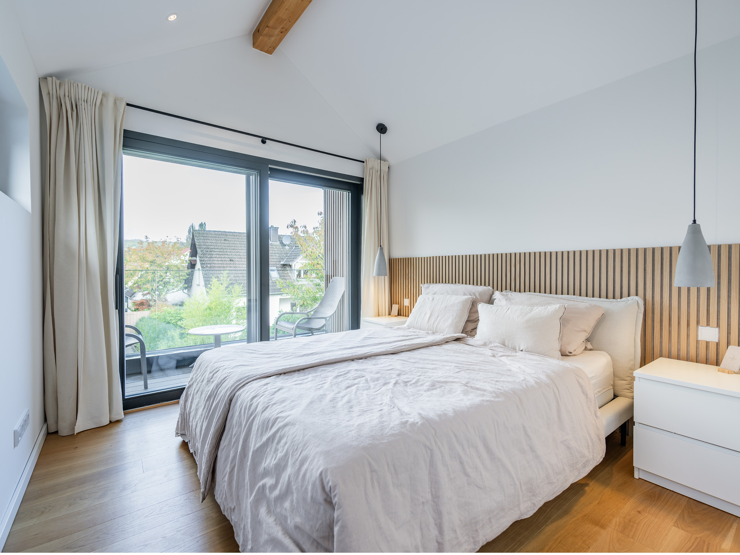 Den Holzpaneelen im Schlafzimmer und die Holzverkleidung der Küche verströmen im ganzen Haus einen wohligen, beruhigenden Holzgeruch. Das offene Raumkonzept und die offene Verbindung der Wohnräume – Küche, Esszimmer und Wohnzimmer – geben Flexibilität und den Raum, sich ausleben zu können.