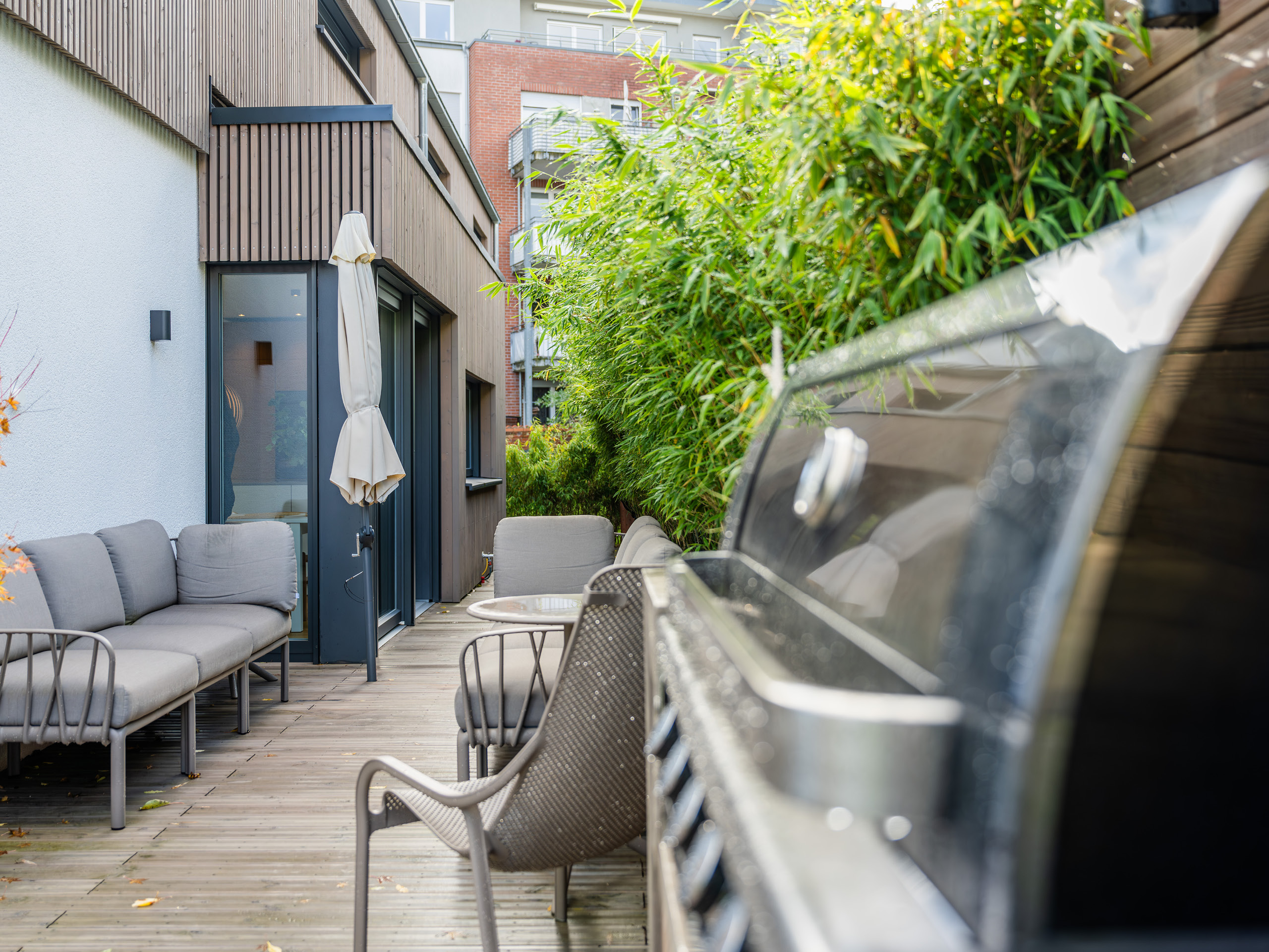 Das zweistöckige, kellerlose Haus wurde in zweiter Reihe im Garten eines denkmalgeschützten Hauses direkt ins Grüne gebaut. Die großen Fenster und die natürlichen Materialien – vor allem viel Holz – tragen erheblich zum Wohlfühlfaktor bei, den das Objekt schon beim ersten Anblick ausstahlt.
